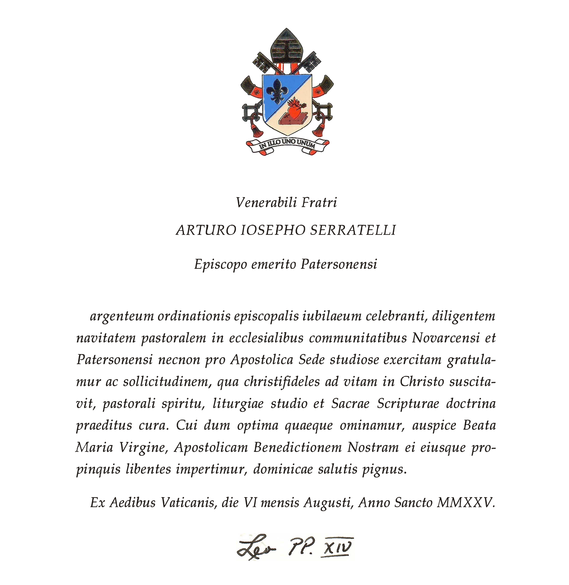 Pope Leo congratulates Bishop Emeritus Serratelli on the silver jubilee of his episcopal ordination