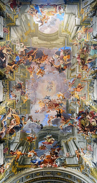 Triumph of St. Ignatius of Loyola by Andrea Pozzo, celebrates the work of Ignatius of Loyola and the Society of Jesus in the world by depicting the saint welcomed into paradise by Christ and surrounded by allegorical representations of the four continents. The trompe-l’œil fresco adorns the flat ceiling of the Church of St. Ignatius of Loyola at Campus Martius. Today is Ignatius of Loyola’s feast day.
