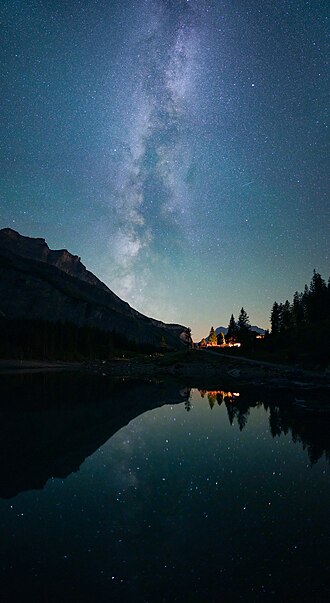 Vertical panorama of the Milky Way during Perseids photographed from Oeschinen Lake with water reflections
