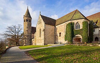 Abbey church and bell tower of the former Benedictine monastery Lorch Abbey in Lorch, Germany.