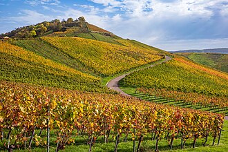 Vineyards with colourful autumn leaves at the Scheuerberg in Neckarsulm, Germany.