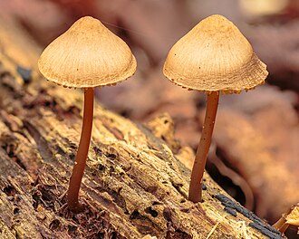 Two tender mushrooms (Mycena galericulata) on dead wood lying under the trees. Focus stack of 20 photos.